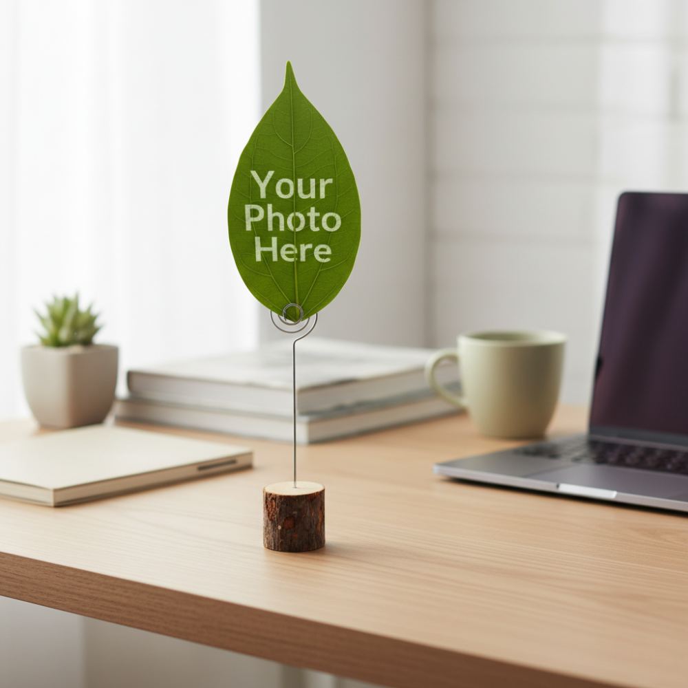 Your cherished photo or message is precisely laser-engraved onto a 100% real, sustainably collected leaf, then sealed for lifelong preservation. It is elegantly displayed with a minimalist wire stand on a rustic Natural Wooden Base, making it the perfect year-round accent for desks, shelves, and nature-inspired home decor.