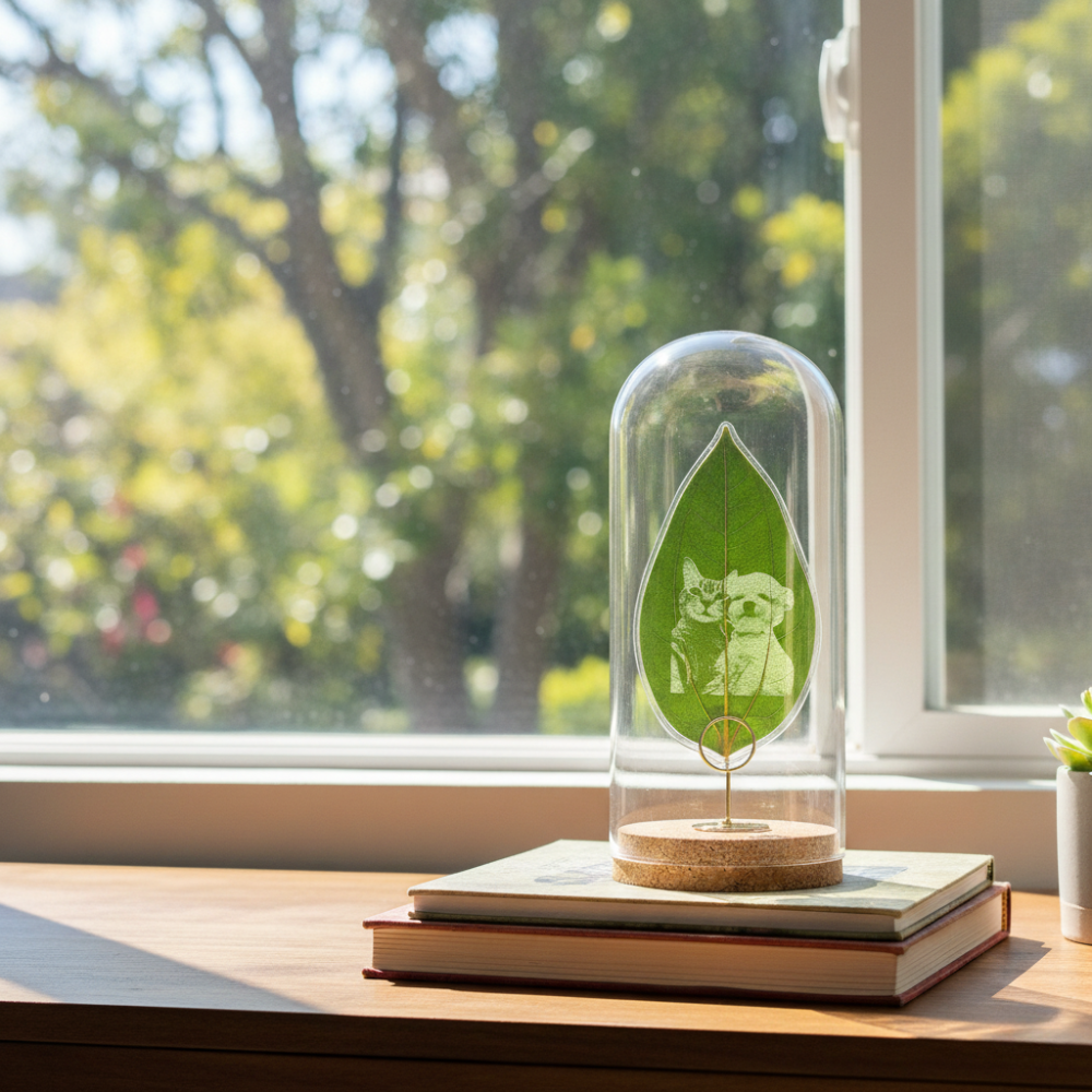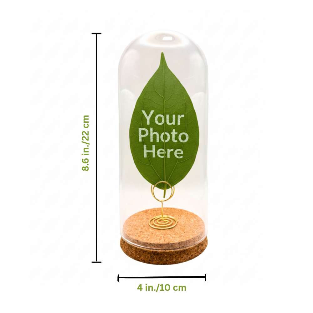 Our signature Custom Leaf Photo Art is exquisitely displayed inside a crystal-clear Glass Dome. Your cherished photo or message is precisely laser-engraved onto a 100% real, sustainably collected leaf, and elegantly mounted on a natural cork base. This piece is the ultimate personalized memorial gift or unique keepsake, designed to eternally preserve your most meaningful memories.