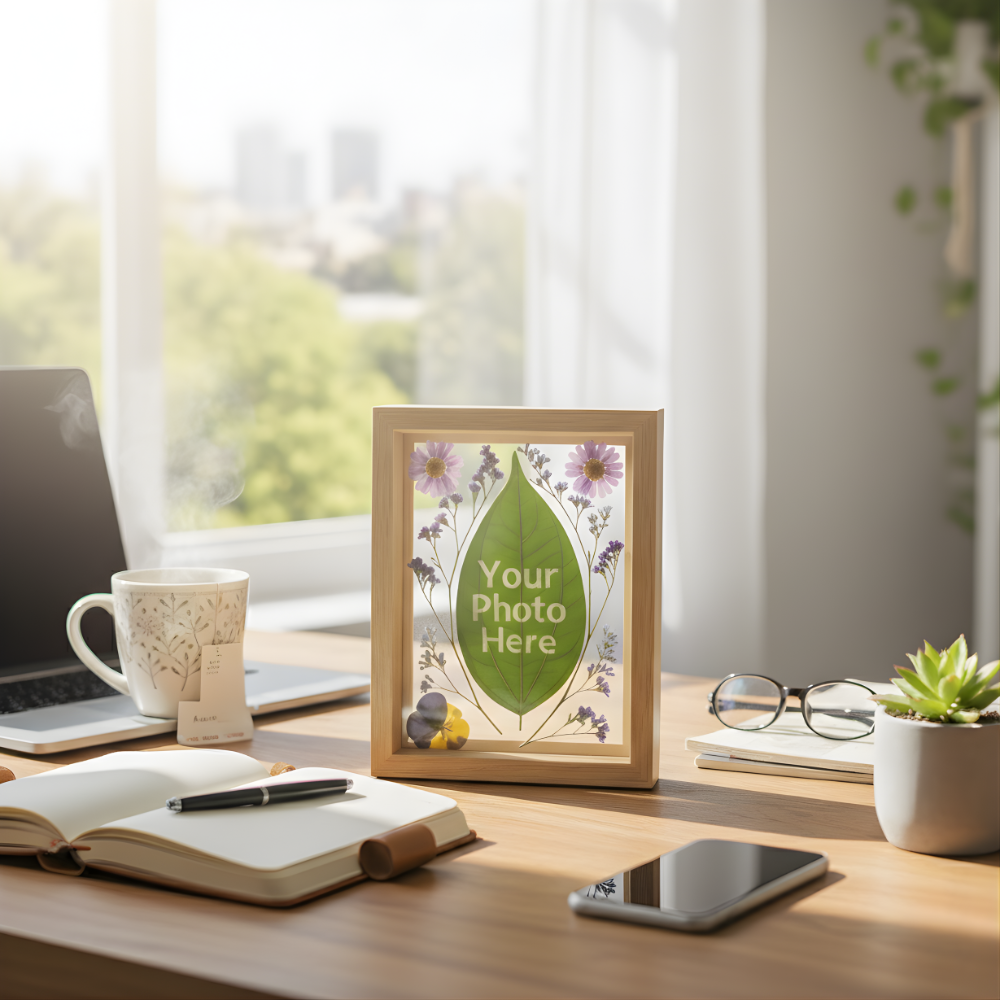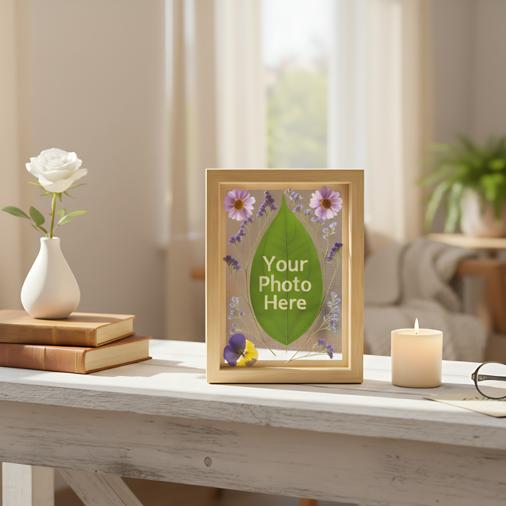 Our signature Custom Photo Leaf Art transforms your most cherished photo or message into stunning, living decor. Your memory is precisely laser-engraved onto a 100% real, sustainably collected leaf, sealed for preservation, and beautifully arranged with delicate Preserved Dried Flowers. The art is then presented in a classic Natural Wooden Frame with a clear glass front (Dimensions: 6.6 × 8.3 × 1.6 in).