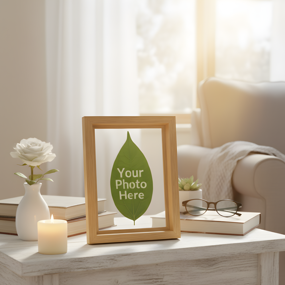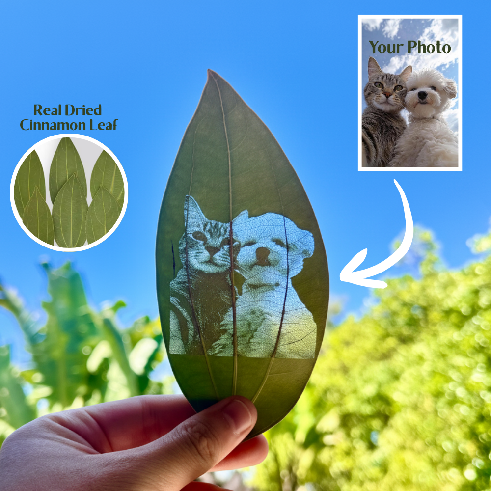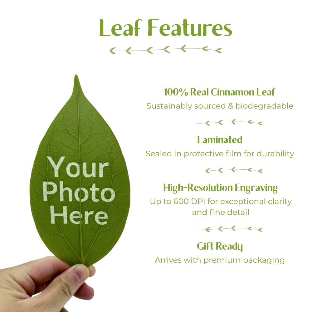 Our signature Custom Photo Leaf Art transforms your image into a stunning, unique piece of decor. Your memory is precisely laser-engraved onto a 100% real, sustainably collected leaf, sealed for preservation, and beautifully presented in a classic Natural Wooden Frame with a clear glass front (Dimensions: 6.6 × 8.3 × 1.6 in).
