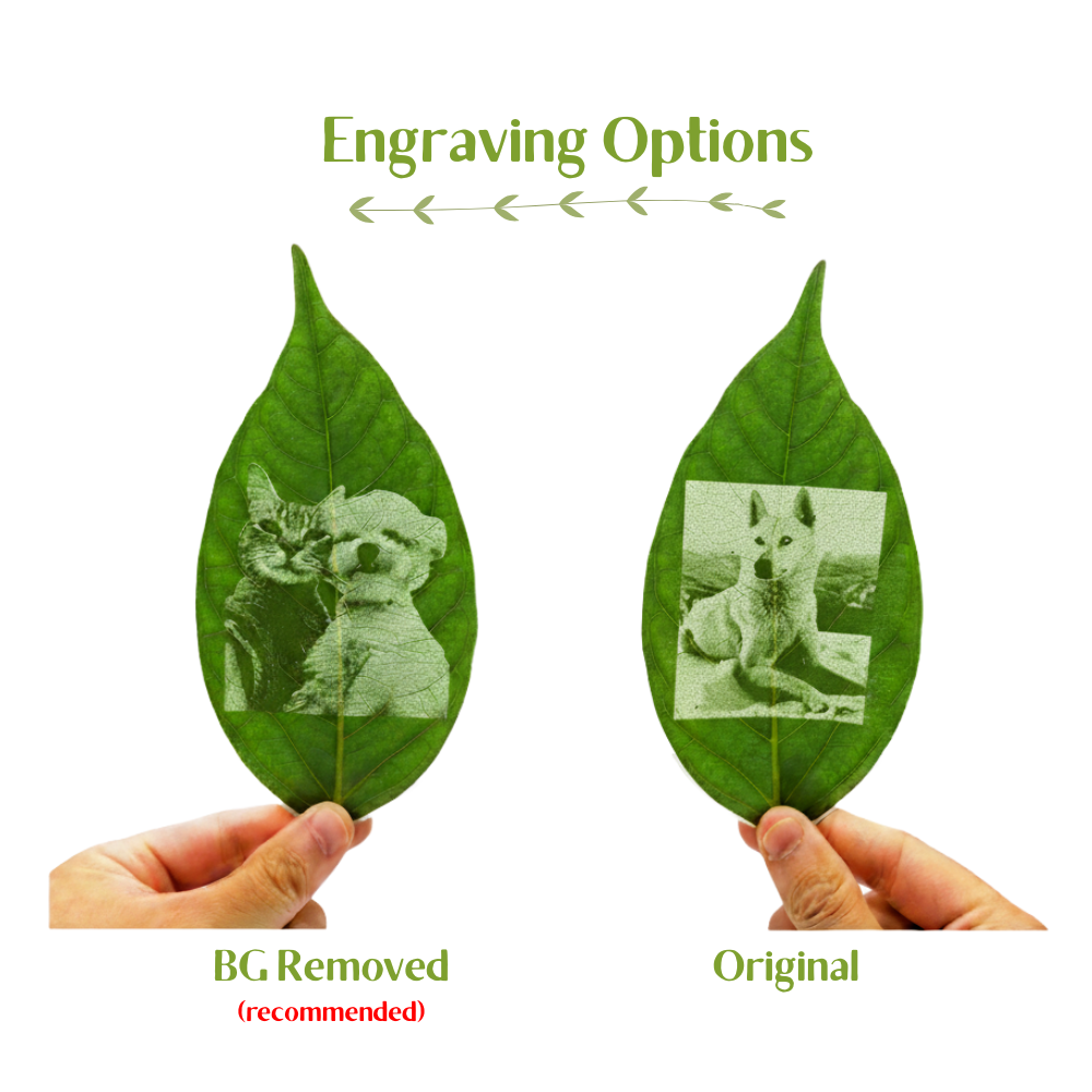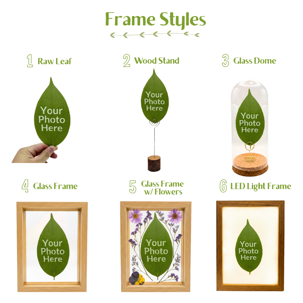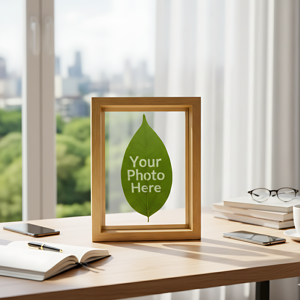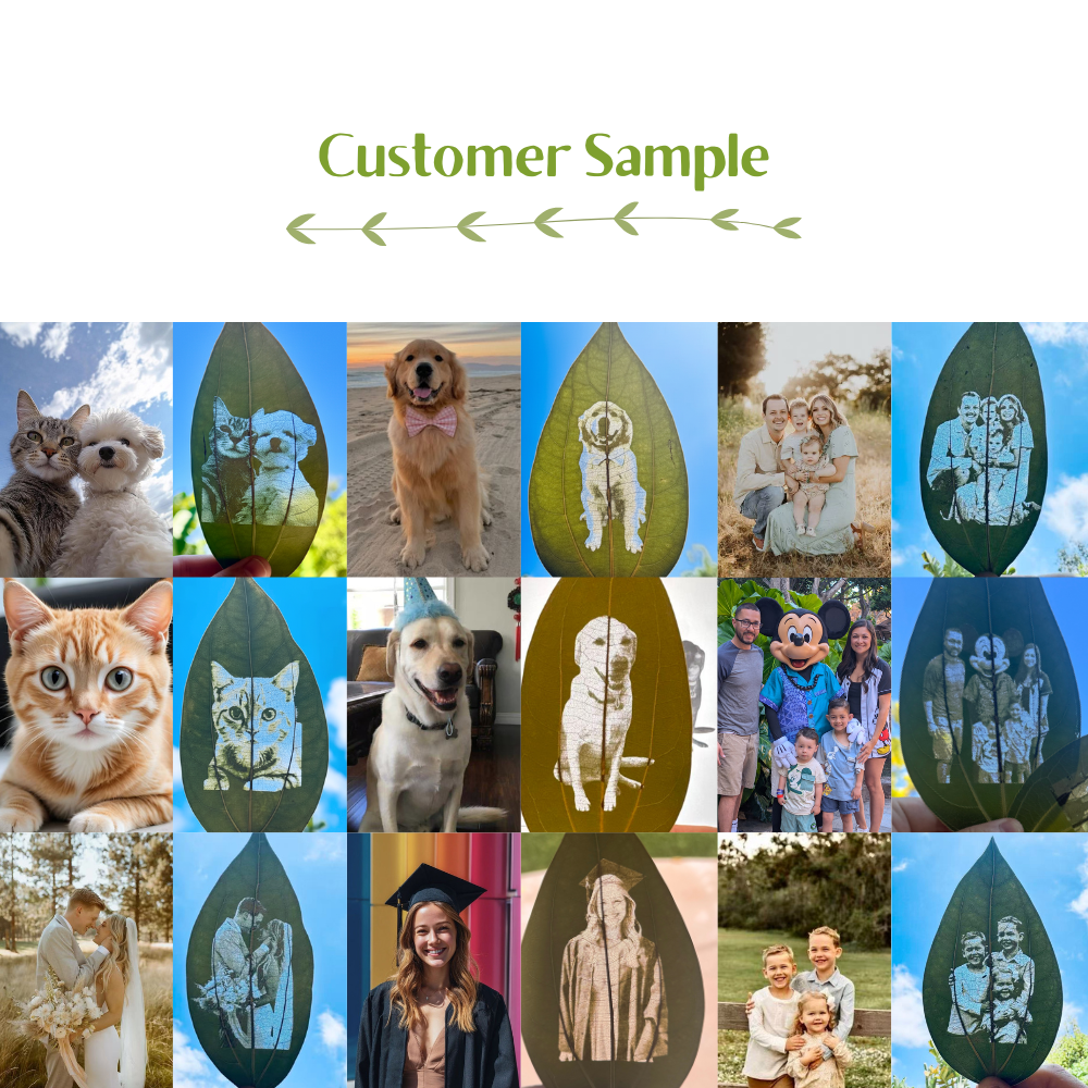 Our signature Custom Photo Leaf Art transforms your image into a stunning, unique piece of decor. Your memory is precisely laser-engraved onto a 100% real, sustainably collected leaf, sealed for preservation, and beautifully presented in a classic Natural Wooden Frame with a clear glass front (Dimensions: 6.6 × 8.3 × 1.6 in).